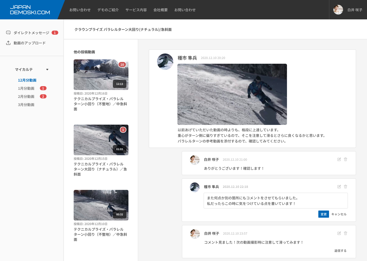 JAPAN-DEMOSKI.comは、日本最高峰のデモンストレーター*1による プライベートレッスンを、好きな時間に好きな場所で受講できる*2オンラインサービスです。 通常レッスンを受けることが難しい人気講師が、シーズンを通して一貫した指導であなたの滑りを向上させ、 目標達成を最大限支援します。
